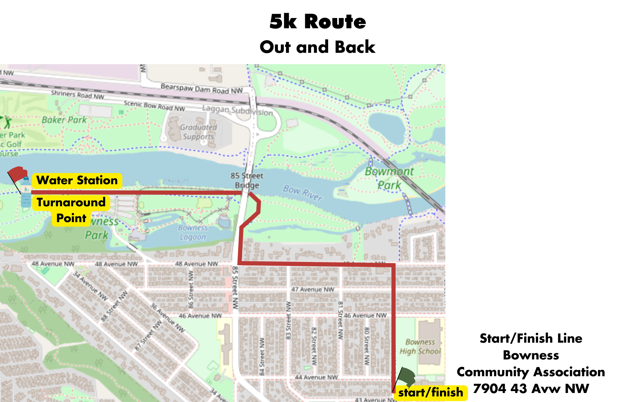 The event is possible with the support of volunteers, local businesses, and community partnerships. The race begins at the Bowness Community Centre, and the route goes through Bowness Park and Baker Park.