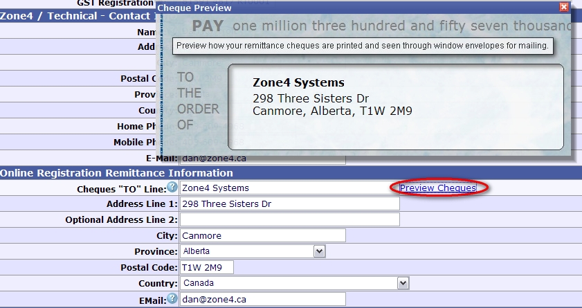 Zone4 has introduced a series of upgrades to further streamline remittances as well as to clarify the typical progression of club registration building, testing, and going live. Computer Printed Cheques and Additional Remittance Address Fields In order to increase efficiency and accuracy at Zone4, we are moving to computer printed remittance cheques. This means that all club and race registration remittances will be printed directly onto cheques instead of hand-written. This change along with other feedback necessitated the addition of a third set of address fields on your Club Settings->Contact / Address Info area. You will now see a full set of address information specifically for remittances. This is useful if you want remittance cheques going to a third person such as a club treasurer instead of either the Club Address or Technical Contact address as limited to before. These fields allow you to specify exactly how you want the cheques to be printed keeping in mind that the cheques not only need to have the proper "TO" text specified (such as the club name) but also the address that will be viewed through the window envelopes for mailing. Click the Preview Cheques link pops up a visual preview of how the cheques will be printed.