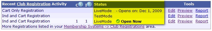 The new TestMode/LiveMode Status concepts are also seen clearly on the Club Registration access panels. This should provide a better visual indicator of what registration are currently open or opening soon.