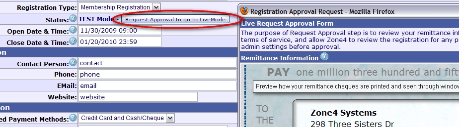 So now instead of the Live / Visible setting, clubs will only see a Status field which starts off in TestMode for Building, Testing, and Revision purposes. When a registration has been built and tested, the club can click the "Request Approval to go to LiveMode" button. This pops up the following dialog which serves several purposes. Firstly it allows you to review your club's remittance information and to see how your cheques will be printed. It also ensures that you have agreed to Zone4's Terms of Service document. And finally it provides a method for Zone4 to review your request before LiveMode approval is granted and to set certain admin settings that will be critical in version 2 coming in the future. Upon submitting your approval request, Zone4 is notified and will process your request as soon as possible. You will be e-mailed as to the status of your request. If changes are required or recommended, the e-mail will tell you what issues Zone4 has found and what needs to be changed. Once LiveMode has been approved, your registration is taken out of TestMode, removing all the TestMode transactions, and is now ready for the Live portion of it's operation. In LiveMode the Open and Close status of your registration is controlled solely by your Open and Close dates. So if the registration is in LiveMode but the current date is before your Open Date, the front end of the registration will say "The Registration isn't open yet. It is scheduled to open at: XYZ." And of course after your registration has closed, it will say "Closed" and not revert back to TestMode.